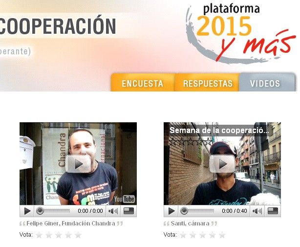 Además, algunas personas se animaron a subir sus testimonios en video a youtube. Entre estas personas, Leire Pajín (ex-secretaria de Estado de Cooperación Internacional y Desarrollo) afirma que hay que entender la cooperación "desde el hecho de que el mundo en el que vivimos es tremendamente injusto". Para Leire, "cooperar supone acompañar a aquellos hombres y mujeres que están luchando en este momento por que el mundo sea más justo", contribuyendo a que cada persona "pueda ser dueña de su propio futuro".