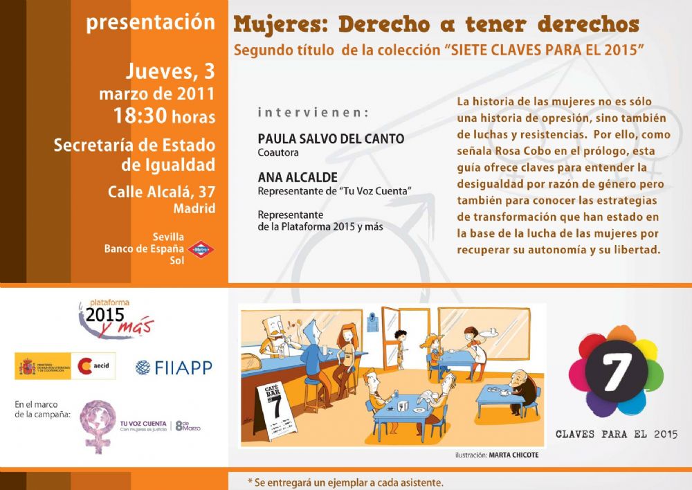 El próximo 3 de marzo a las 18.30 horas, en el salón de actos de la Secretaría de Estado para la Igualdad (C/ Alcalá, 37), la Plataforma 2015 y más presenta la guía "Mujeres: Derecho a tener derechos", un texto para comprender las causas de la discriminación de las mujeres en todo el mundo, así como para conocer las estrategias que el movimiento feminista y de mujeres ha llevado a cabo para lograr su autonomía y libertad.