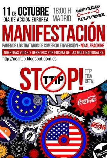 Por todo lo anterior, nos sumamos a la convocatoria de movilizaciones europeas contra el TTIP el próximo 11 de octubre. En Madrid la manifestación partirá de Atocha a la plaza de