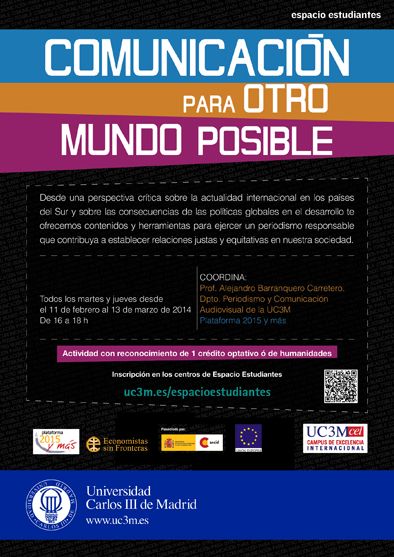Durante los meses de febrero y marzo, el Espacio Abierto / Espacio Estudiantes de la UC3M la Plataforma 2015 y más y Economistas sin Fronteras convocan la II Edición del taller "Comunicación para Otro Mundo Posible", orientado a estudiantes de grado y postgrado de periodismo y comunicación audiovisual.
