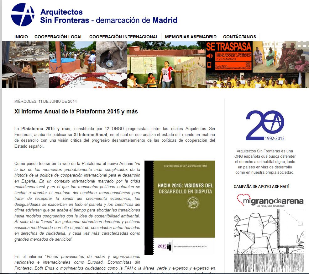 La Plataforma 2015 y más, constituida por 12 ONGD progresistas entre las cuales Arquitectos Sin Fronteras, acaba de publicar su XI Informe Anual, en el cual se que analiza el estado del mundo en materia de desarrollo con una visión crítica del progresivo desmantelamiento de las políticas de cooperación del Estado español.