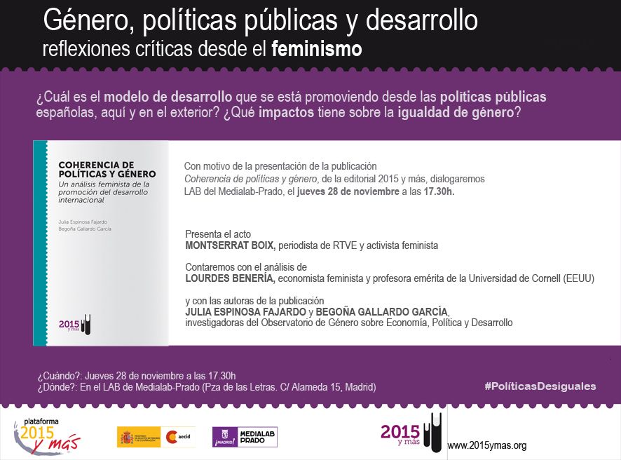 Con motivo de la presentación de la publicación Coherencia de políticas y género: un análisis feminista de la promoción del desarrollo internacional, la Plataforma 2015 y más y el MediaLab Prado os invitamos a participar de un diálogo en el que analizaremos estas y otras cuestiones de la mano de Montserrat Boix, periodista de RTVE y activista feminista, Lourdes Benería, economista feminista, profesora de Economía de la Universidad de Cornell (EEUU), así como las autoras de la publicación, Julia Espinosa Fajardo y Begoña Gallardo García, investigadoras del Observatorio de Género sobre Economía, Política y Desarrollo.
