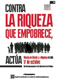 La Alianza española contra la pobreza en Madrid convoca una marcha que parte desde la delegación de Hacienda, C/ Alcalá nº 5 para finalizar en Neptuno. El lema de esta semana contra la pobreza es "Contra la riqueza que empobrece, actúa", y se denunciará la necesidad de llevar a cabo medidas de justicia fiscal frente a la pobreza y como alternativa a los recortes.