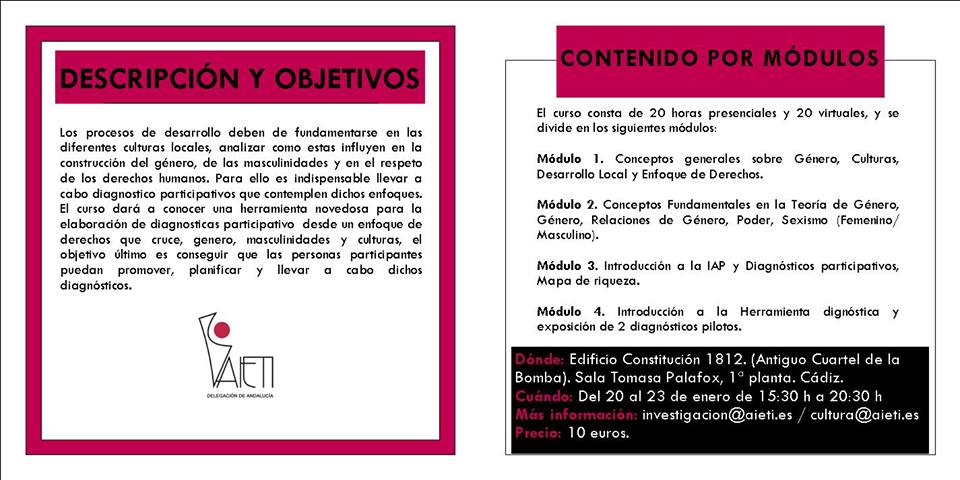 Los procesos de desarrollo deben de fundamentarse en las diferentes culturas locales, analizar como estas influyen en la construcción del género, de las masculinidades y en el respeto de los derechos humanos. Para ello es indispensable llevar a cabo diagnostico participativos que contemplen dichos enfoques. El curso dará a conocer una herramienta novedosa para la elaboración de diagnosticas participativo desde un enfoque de derechos que cruce, genero, masculinidades y culturas, el objetivo último es conseguir que las personas participantes puedan promover, planificar y llevar a cabo dichos diagnósticos.