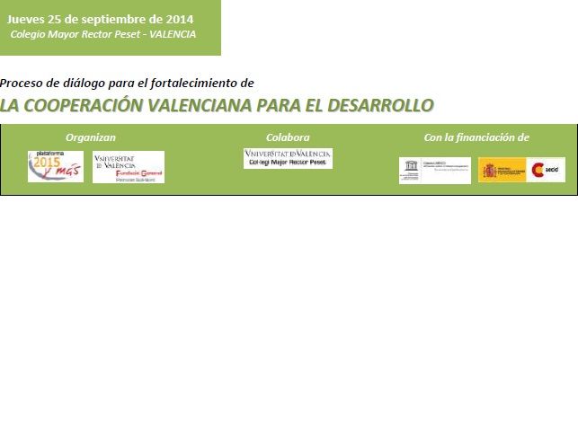 Proceso de diálogo para el fortalecimiento de LA COOPERACIIÓN VALENCIIANA PARA EL DESARROLLO. Un espacio de reflexión y propuesta colectiva para mejorar la cooperación para el desarrollo realizada desde la Comunitat Valenciana impulsada por la Plataforma 2015 y más.