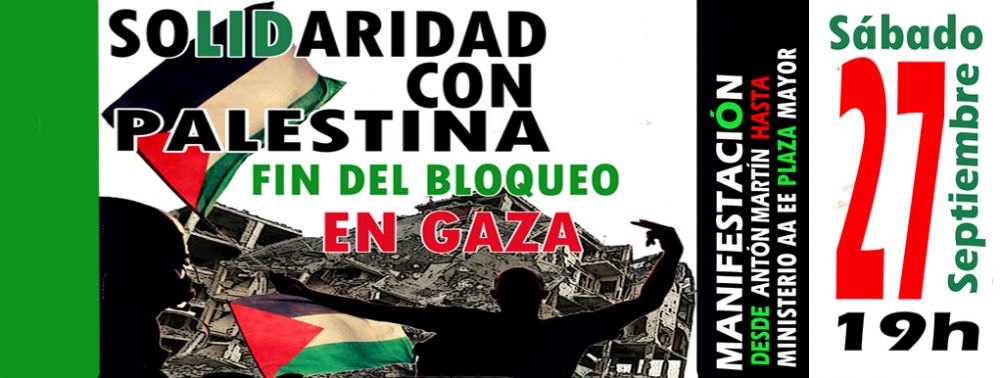 En solidaridad con Palestina y por el fin del bloqueo en Gaza os convocamos a participar en esta manifestación en Madrid el sábado 27 de septiembre a las 19.00h en Antón Martín.