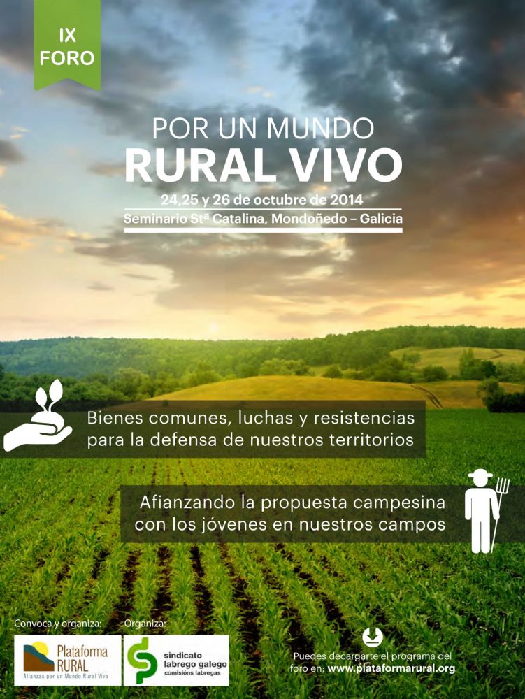 Durante los días 24, 25 y 26 de octubre de 2014, la Ciudad de Mondoñedo (Lugo), acogerá el IX Foro por un Mundo Rural Vivo, bajo el lema: "Bienes comunes, luchas y resistencias para la defensa de nuestros territorios. Afianzando la propuesta campesina con los jóvenes en nuestros campos". Convocado por Plataforma Rural, en esta ocasión, la organización anfitriona y coorganizadora del evento es el Sindicato Labrego Galego.