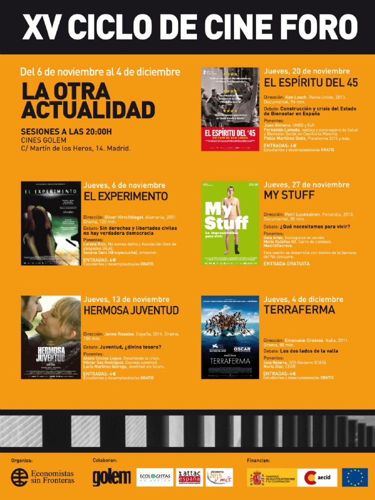 Ya está aquí de nuevo el cine foro La Otra Actualidad, impulsado por Economistas sin Fronteras. Este año cumple 15 años Os esperamos todos los jueves desde el 6 de noviembre hasta el 4 de diciembre en los cines Golem, a las 20.00 horas (entradas: 4 € y gratis para estudiantes y desempleados/as).