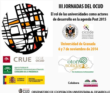 Las III Jornadas del OCUD, coorganizadas por la Comisión de Internacionalización y Cooperación de la Conferencia de Rectores de las Universidades Españolas (CICUE-CRUE), la Agencia Andaluza de Cooperación Internacional para el Desarrollo (AACID) y la Universidad de Granada, tendrán lugar en Granada los días 6 y el 7 de Noviembre de 2014, y se centrarán en el proceso de definición y difusión de la Agenda post 2015 en la universidad española.