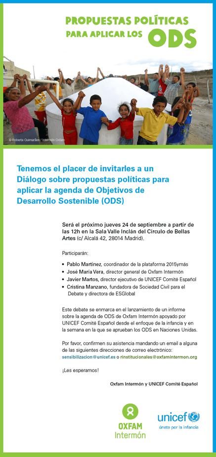 El jueves 24 de septiembre participamos en el diálogo organizado por Oxfam Intermón y Unicef sobre propuestas políticas para aplicar la nueva agenda de desarrollo. En el diálogo participará Pablo José Martínez Osés, de la Plataforma 2015 y más, José María Vera, de Oxfam Intermón, Javier Martos de UNICEF, Cristina Manzano, de ESGlobal.