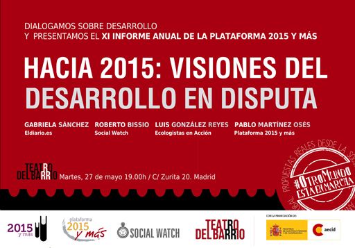 Un año más nos gustaría invitarte a participar en la presentación del XI Anuario de la Plataforma 2015 y más. En esta ocasión, además de presentar las principales conclusiones del informe, dialogaremos sobre desarrollo con Gabriela Sánchez (responsable de El Desalambre, de Eldiario.es), con Roberto Bissio (coordinador de Social Watch), con Luis González Reyes (Ecologistas en Acción), y con Pablo Martínez Osés (coordinador de la Plataforma 2015 y más).